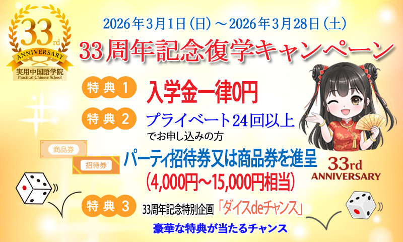 実用中国語学院は、おかげさまで33周年を迎えます。