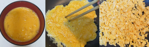 1.フライパンにサラダ油を大さじ2入れ、火にかけます。よく混ぜた卵液を流し入れ、菜箸でかき混ぜながら加熱し、ポロポロとした小さなそぼろ状になるまで炒めます。