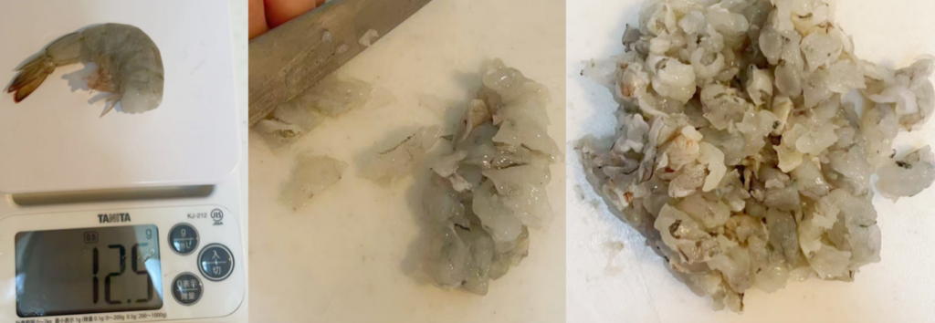2.殻付きのエビ200gは、殻をむいて背ワタを取り除き、包丁で少し大きめに切ります。