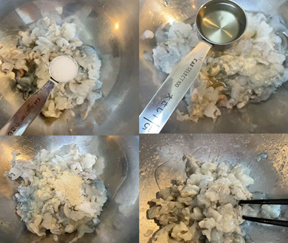 3.塩小さじ1・白こしょう3g・サラダ油大さじ1を加えて軽く混ぜます。