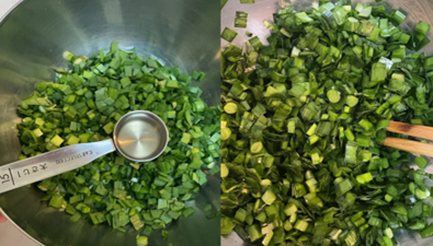 4.ニラは水気をよく切り、包丁で刻みます。その後、油大さじ2を加えて混ぜ、水分が出ないようにします。