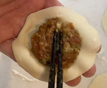 1.伸ばした皮(約11g)の中央に、適量の具(約11g)をのせます。このとき具を入れすぎないよう注意します。のせた後、箸で軽く押さえて整えると包みやすくなります。