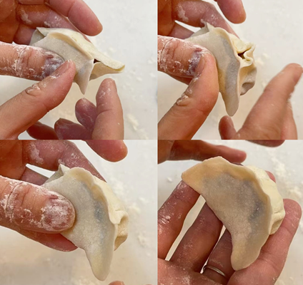 3.片側の皮にひだを寄せながら、中央部分ではなく、手前側の縁をつまんで留めていきます。反対側も同じ要領で包みます。一番重要なのは、口が開かないよう皮をしっかり閉じることです。