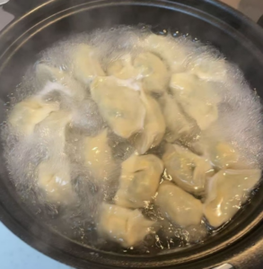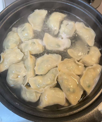 3.餃子がふっくらと膨らんで浮かび上がり、皮が透き通ってきたら、ゆで上がりです。