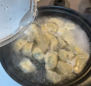 1.深い鍋にたっぷりの湯を沸かし、沸騰したら餃子を入れます。餃子が鍋底にくっつかないように、おたまで軽くかき混ぜます。