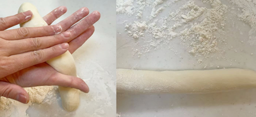 1.まな板に小麦粉をまぶし、「皮」の生地をひとつかみ切って取り出し、手で棒状にのばします。