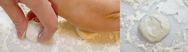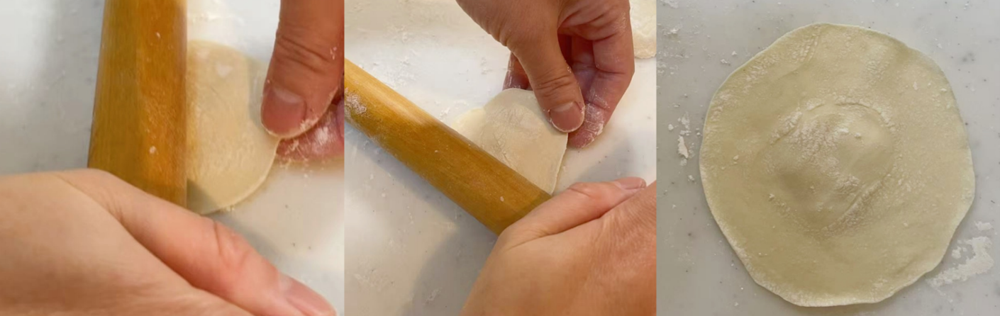 4.麺棒で生地を丸く伸ばします。右手で麺棒を前後に動かし、左手で生地を少しずつ回します。一回で伸ばすのは生地の真ん中くらいまでにします。こうすると、中央が厚く、周りが薄い皮に仕上がります。