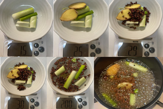 最初に、香味水(ねぎ・しょうが・花椒・八角を煮出したもの)を準備します。
