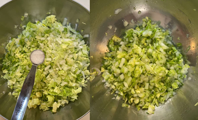 1.まず白菜を細かく刻み、塩をふって水気を出します。肉だねの準備ができたら、白菜の水分をしっかり絞ります。